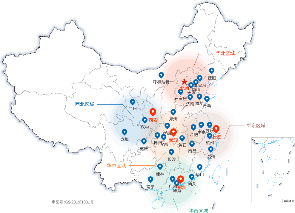 業(yè)務覆蓋華北、華東、華中、華南、西北五大區(qū)域,以北京、上海、武漢、深圳、西安等城市為中心,向全國擴展。