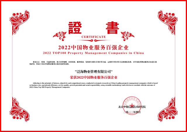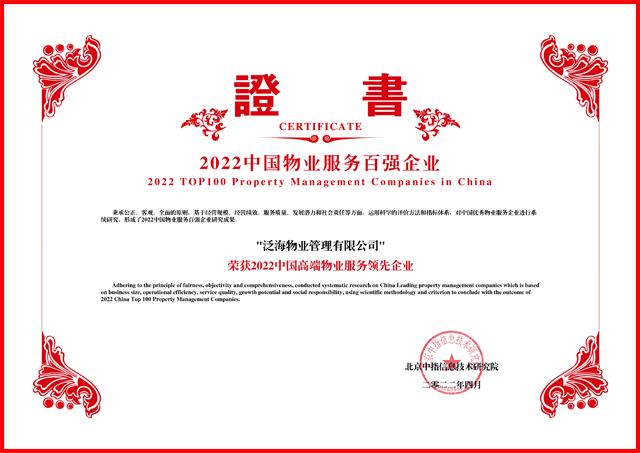 泛海物業(yè)秉承“敬業(yè)、守信、忠誠、奉獻、開拓、創(chuàng)新、立志、圖強”的企業(yè)精神和“真誠相伴,百年知己”的服務(wù)理念,始終堅持“讓生活更舒適、讓資產(chǎn)更增值,讓城市更美好”為使命,為高端物業(yè)服務(wù)、城市空間運營提供更科學(xué)、系統(tǒng)、高效的全業(yè)態(tài)、全周期、全新解決方案,實施智慧物業(yè)雙平臺戰(zhàn)略,持續(xù)提升客戶價值,致力于打造具有國際管理水平的綜合型智慧物業(yè)服務(wù)企業(yè),成為一流成綜合城市服務(wù)商,攜手共創(chuàng),引領(lǐng)發(fā)展,創(chuàng)造城市新生活。泛海物業(yè)以其優(yōu)異的表現(xiàn)榮膺“2022中國物業(yè)百強企業(yè)”稱號、“2022中國科技賦能領(lǐng)先企業(yè)”稱號、“2022中國高端物業(yè)服務(wù)領(lǐng)先企業(yè)”榮譽。