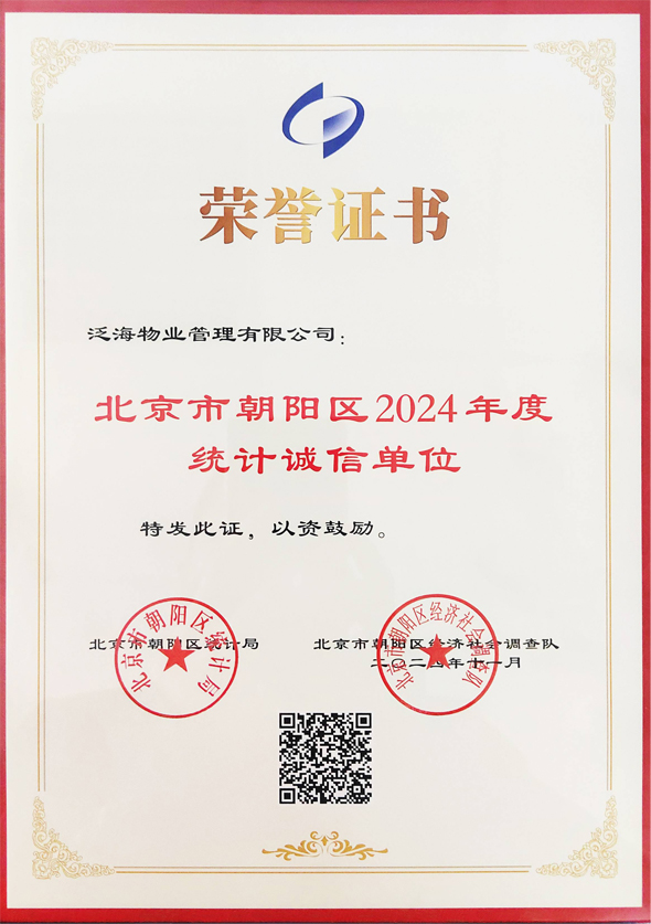 歷經(jīng)層層嚴格選拔與細致審核,泛海物業(yè)脫穎而出,憑借扎實的統(tǒng)計工作基礎(chǔ)、嚴謹?shù)臄?shù)據(jù)處理流程以及對誠信原則的堅守,被正式評定為 “朝陽區(qū)2024年度統(tǒng)計誠信單位”。