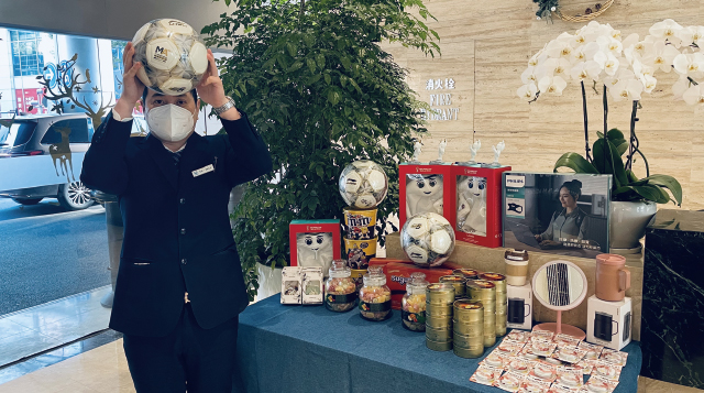 活動(dòng)當(dāng)天,客服部工作人員做好準(zhǔn)備工作—布置會(huì)場(chǎng)。卡塔爾世界杯官方吉祥物名叫“拉伊卜”,在阿拉伯文中的意指“技術(shù)高超的球員”,工作人員把它放在中央,仿佛它正揚(yáng)起可愛的小手歡迎每一位獲獎(jiǎng)的業(yè)主!抽獎(jiǎng)開始時(shí),獲獎(jiǎng)人員佩戴好口罩,有序的領(lǐng)取獎(jiǎng)品并與工作人員合照留念?,F(xiàn)場(chǎng)熱烈的氣氛驅(qū)散了疫情帶來的陰霾,奔跑吧!綠茵場(chǎng)上的英雄們,真正的勇士只應(yīng)將印記留在賽場(chǎng),敬友誼,為悍將齊喝彩,一路激情共悅,獨(dú)抵勝利之巔!