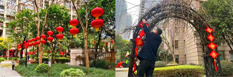 大紅燈籠高高掛,走進(jìn)小區(qū)就看見一抹抹喜慶的紅,掛在樹梢、橫在門楣,喜慶的裝飾營造出濃濃的年味兒,也描繪著家的溫暖與祥和。